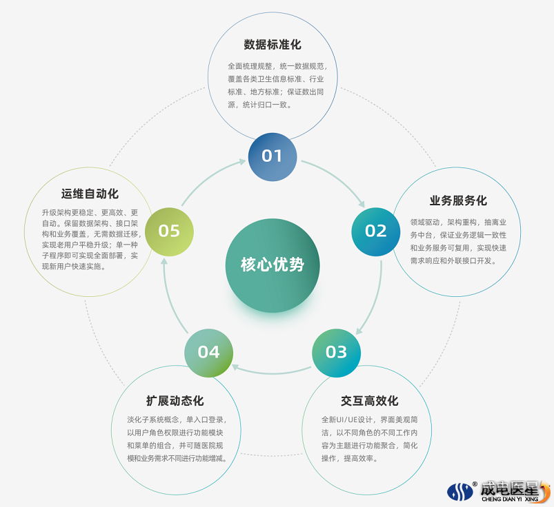 成电医星以20多年的行业积累为基础,以千余家医疗机构用户的业务需求为导向,以各类卫生信息标准为依据,以满足电子病历分级评价6级以上和卫生健康信息标准应用成熟度测评5级以上要求为标尺,重构业务服务和交互体验,匠心打造出全新一代V20版HIS系统、全结构化电子病历系统、医疗信息集成平台、互联网医院平台、统一支付对账平台、DRGs医保控费系统等医疗信息化产品。全面实现新一代智慧医院的数据标准化、业务服务化、运维自动化、扩展动态化、交互高效化。
