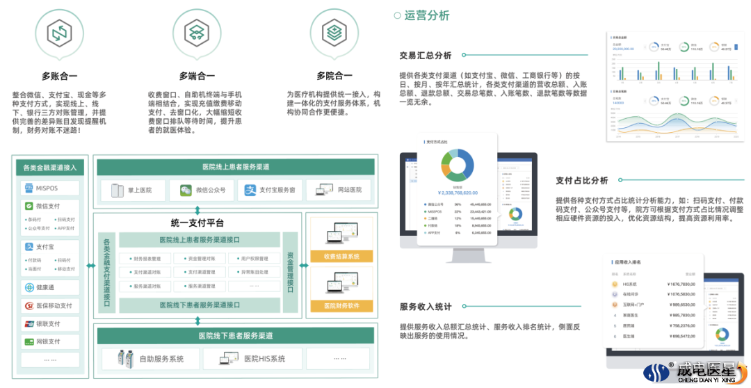 统一支付对账平台,通过整合各种三方金融机构支付接口,实现统一支付、统一对账、集中财务管理。为患者提供多样化支付方式,大大节约患者就医时间,提升患者就医体验。结合线上、线下、银行三方财务数据,实现总账对账、明细对账、实时对账等多种对账方式,为财务提供一账式完整的统一对账平台,减轻财务工作压力,提升医院管理水平。