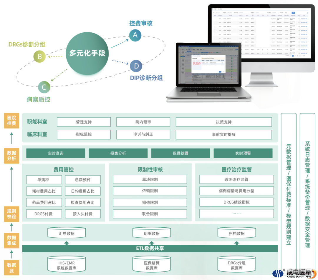 基于医保知识库、医学知识库和规则引擎,采用大数据分析技术实现医院医保资金的实时监测及合理利用,有效杜绝医保不合理报销,确保资金合理利用;通过严格的病案质控,保证DRGs精准分组,依据DRGs达到控制费用、提高医疗质量的效果;并通过数据可视化分析,为管理者提供决策依据。